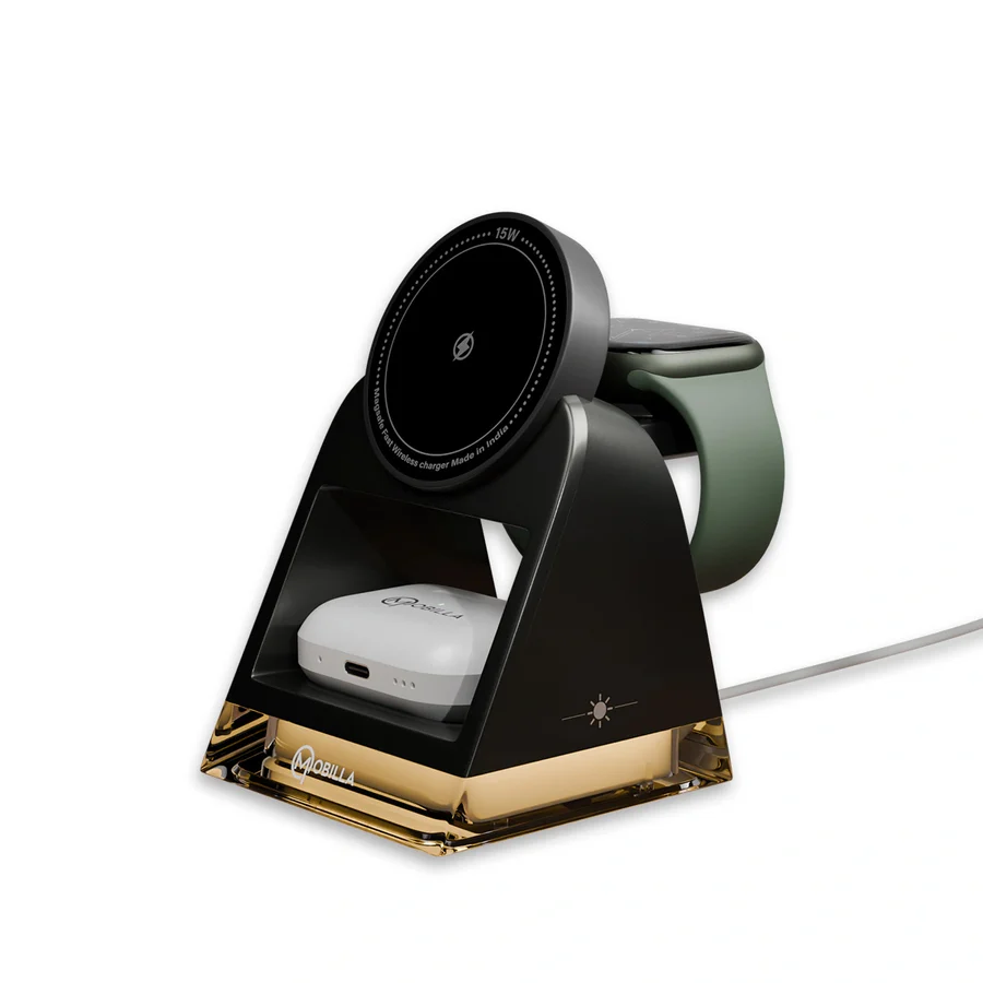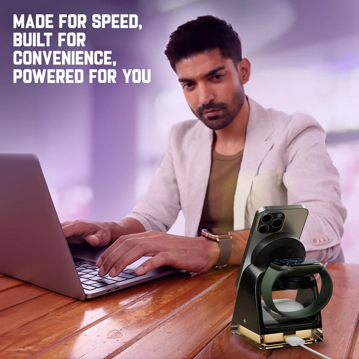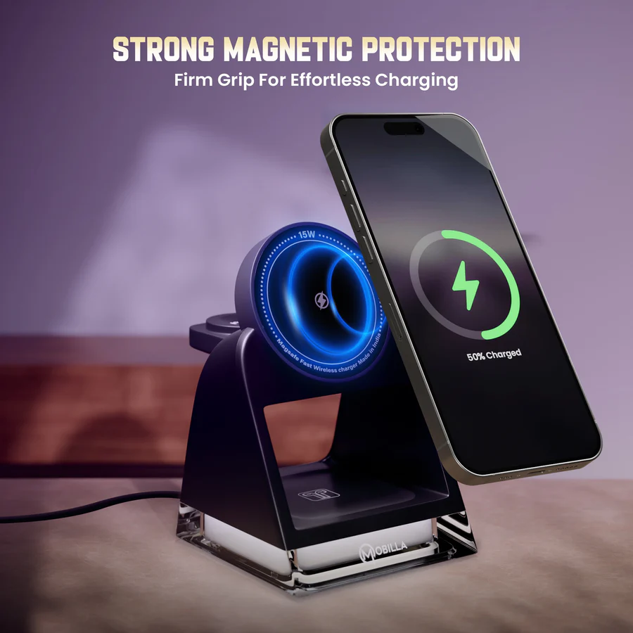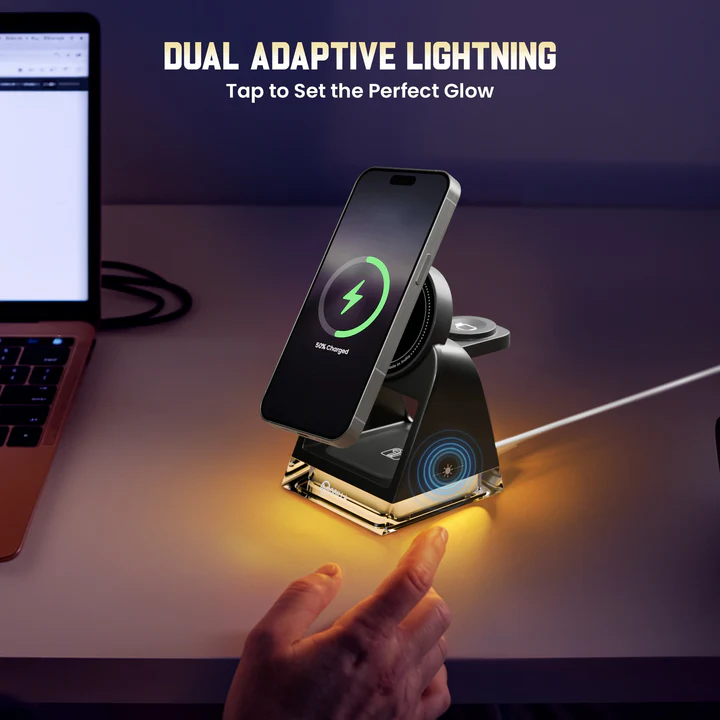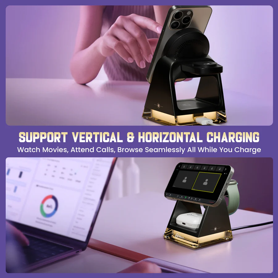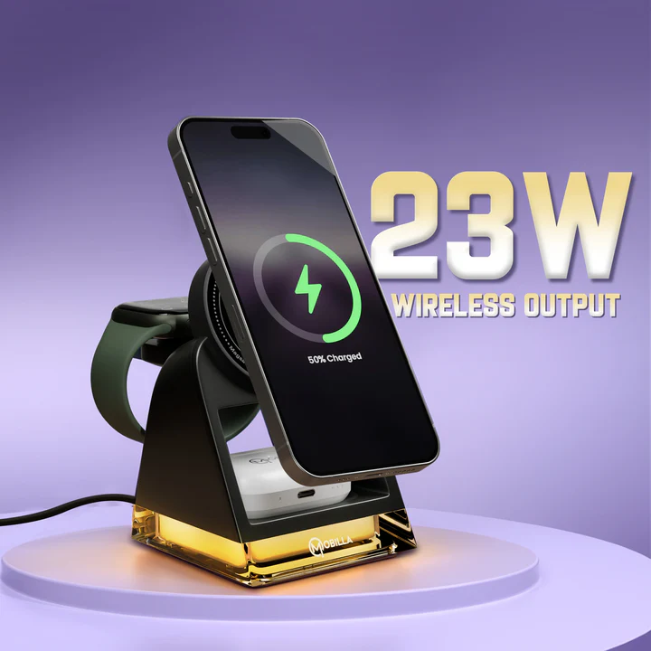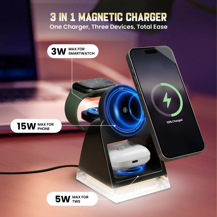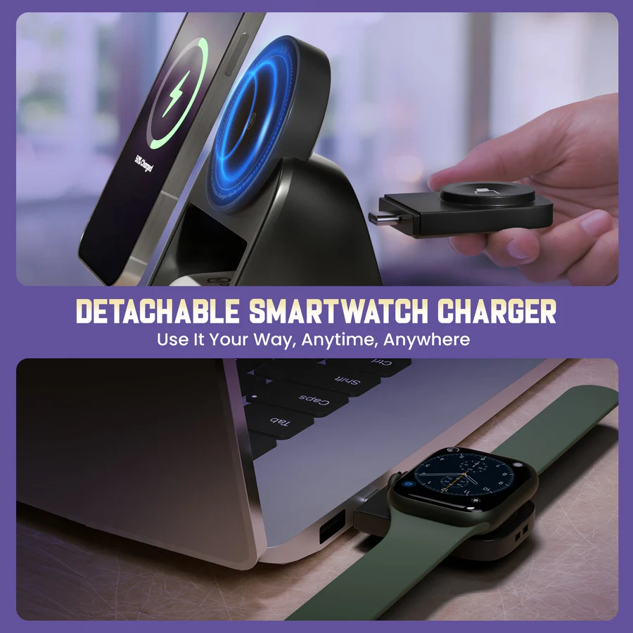 3 in 1 Wireless Charger | 23W Combined Wireless Charging Output | MagSafe Compatible | 15W Wireless Charging Output (Phone) Dual Adaptive Lights | Compact & Portable Design | Sleek Design | Strong Magnet | Secure Charging