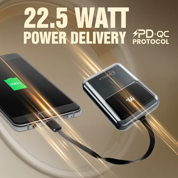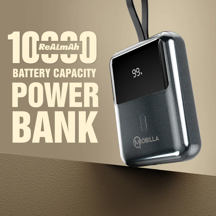 10000mAh Battery Capacity | 22.5W Power Output | Compact & Handy | Built-In Type-C Cable | ReALmAhâ„¢ Battery | Dual Quick Charging Port | Battery Display Indicator | Multi-Layered Protection | Sparkling Finished Design